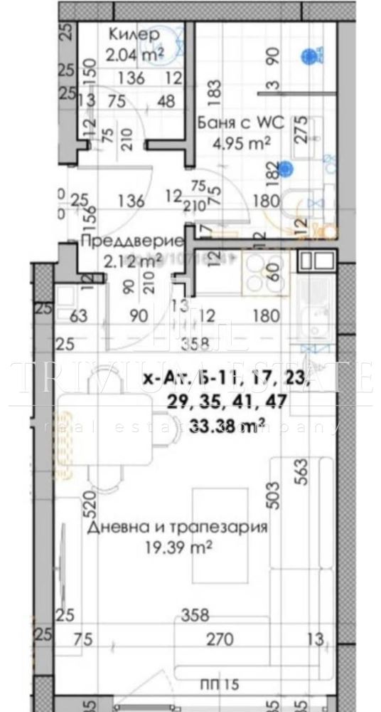 Жилището е с площ от 34 кв.м и има следното разпределение: