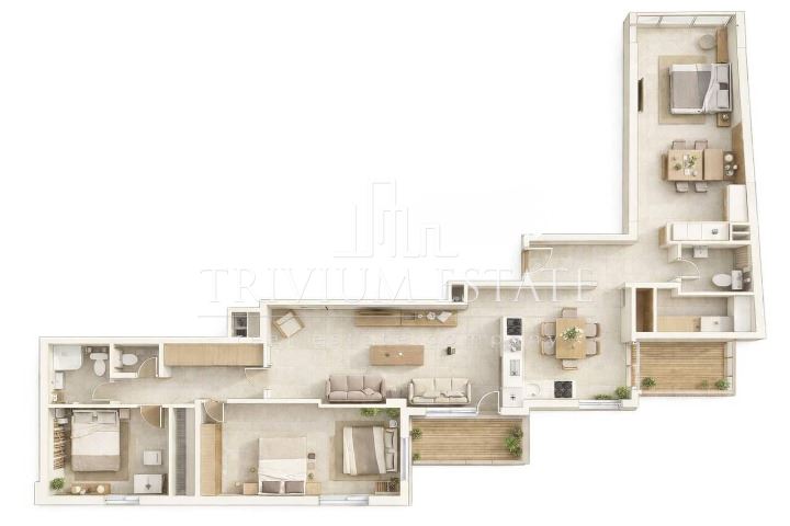 Голямата площ и правилните форми на помещенията създават усещане за простор и естествена светлина. Трите тераси допълват жилището с външни пространства, които повишават качеството на живот в динамичната градска среда.